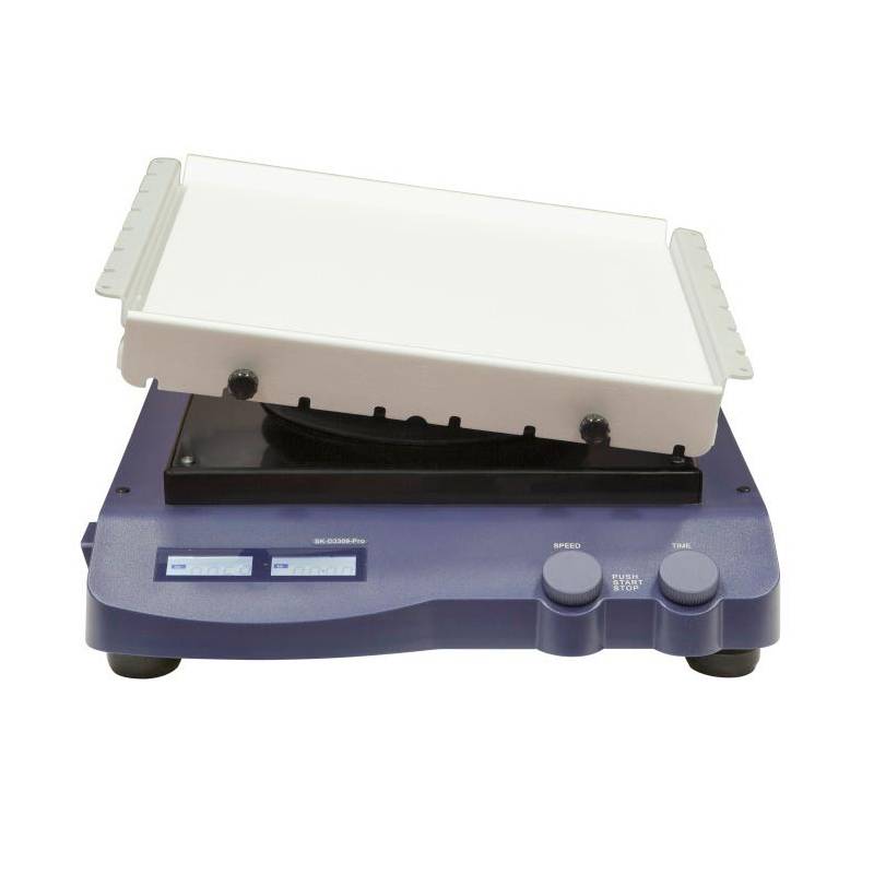 Agitatore a scuotimento orbitale con rotazione oraria e antioraria SKO-D XL. Doppio Display LCD con indicazione della velocità di agitazione e del tempo. Massimo carico di agitazione 7,5 Kg. Velocità di agitazione regolabile da 100…500 colpi/min., regolazione del tempo di agitazione da 1min. …20 ore o continuo. Uscita RS 232.