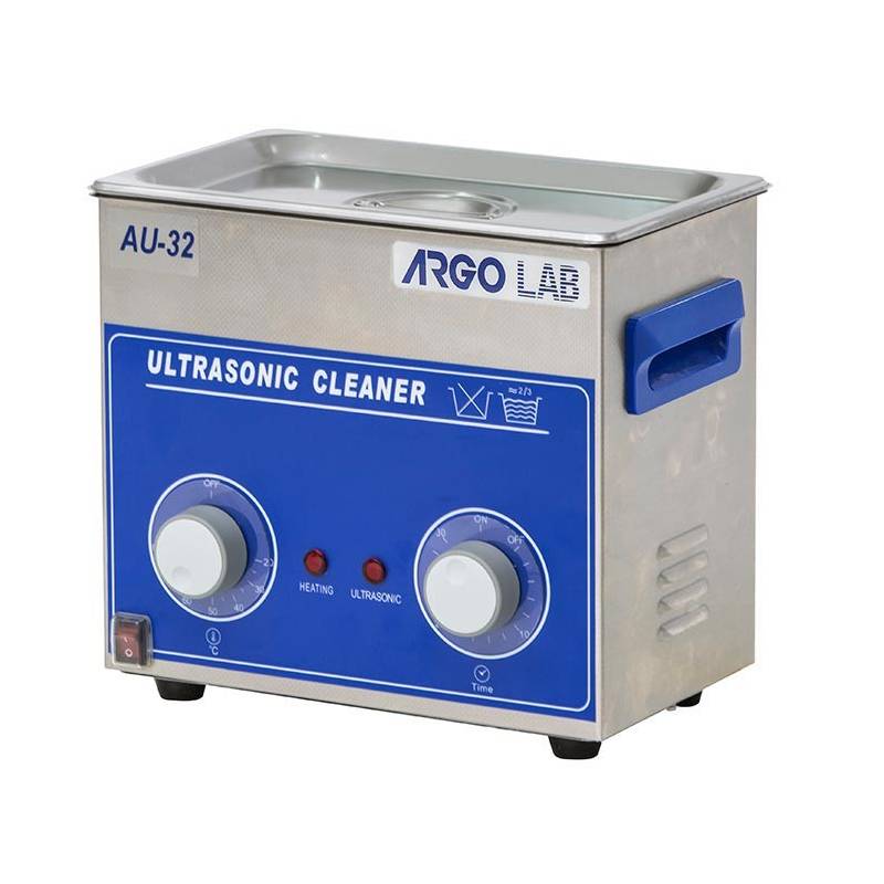 La vasca ad ultrasuoni AU-32 di ARGOLAB è uno strumento analogico con capacità di 3.2 litri dotata di regolazione manuale sia per la temperatura ( max 80°C ) che di timer per gli ultrasuoni. La durata del ciclo di pulizia è regolabile in intervalli di tempo che vanno da 1 a 30 min. oppure infinito fino allo stop manuale.