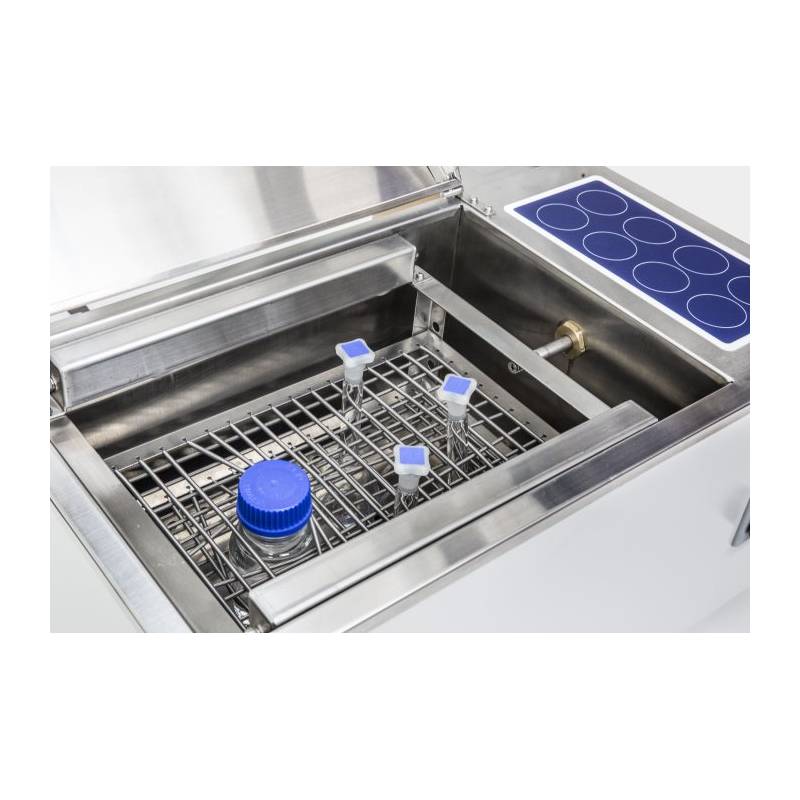 Bagnomaria SB35 con scuotimento lineare orizzontale tipo Dubnoff. Vasca, coperchio, cestello a molla e piano di appoggio per campioni realizzati interamente di acciaio inossidabile. Regolatore elettronico della temperatura con controllo PID e regolazione della velocità di scuotimento tramite manopola.