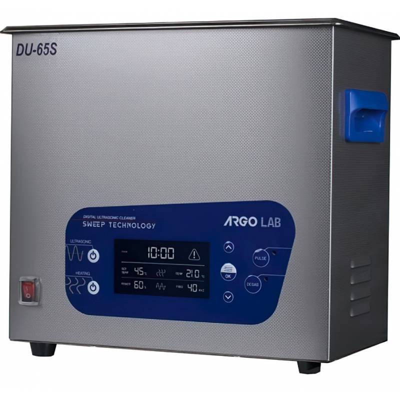 Bagno ad ultrasuoni ARGOLAB DU-65S digitale con capacità: 6,5L. Due frequenze ultrasuoni (28 e 40 kHz). Display luminosi digitali con indicazione della temperatura attuale e di quella impostata. Controllo separato della potenza degli ultrasuoni e del tempo. Regolazione della temperatura fino a 80°C.