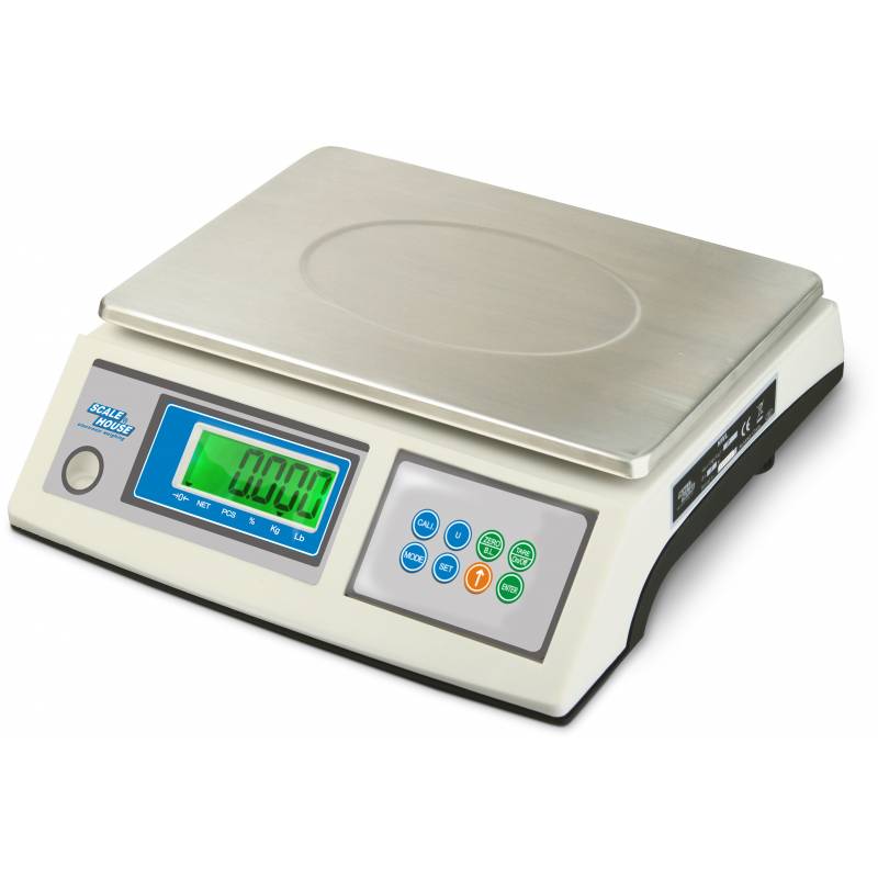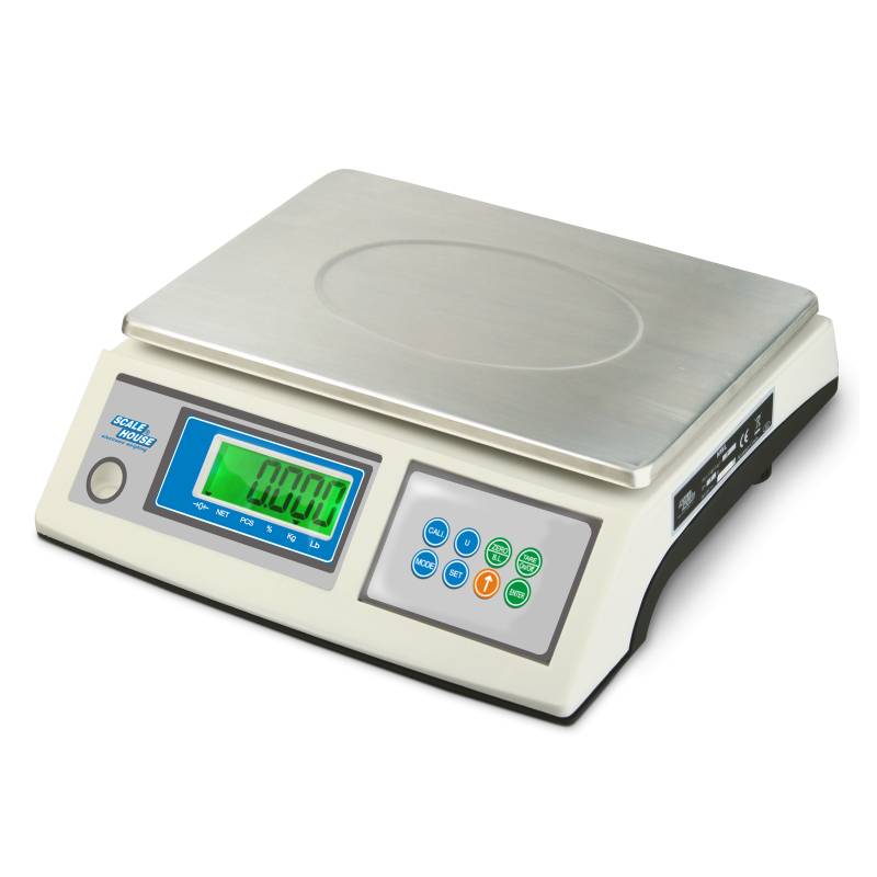 Bilancia da banco Scale House NWL con display LCD retroilluminato. Tastiera meccanica impermeabile con feedback acustico e piatto in acciaio inox. Include bolla di livello, piedini regolabili e batteria ricaricabile con autonomia di 100 ore. Conteggio pezzi, pesata percentuale, controllo peso a due soglie con allarme acustico, conversione kg/lb, tara semiautomatica.