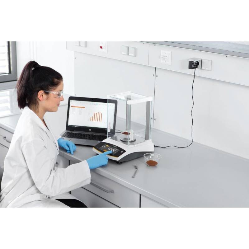 Piatto di pesata inox diametro 90 mm , risoluzione 0.1 mg , alimentatore di rete, interfaccia seriale RS232, protezione con copertura housing in materiale resistente agli aggressivi chimici.