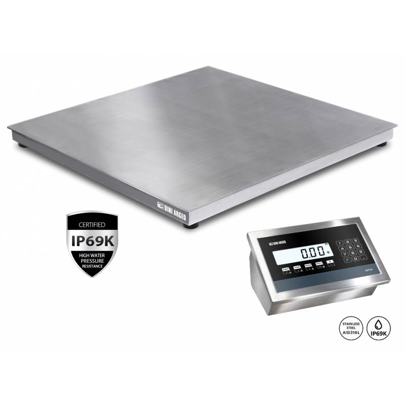 Caratteristiche principali della bilancia IP69K : Piattaforma in acciaio INOX a doppia scala, con celle di carico INOX omologate, adatta per applicazioni di pesatura in ambito industriale e commerciale di ogni tipo. Versione IP69K per singola cella.Funzionamento con 4 celle di carico shear-beam da 1000 Ohm in acciaio INOX.Struttura monoblocco in acciaio INOX, piedini di appoggio regolabili e bolla di livello. Piano di carico fisso in acciaio INOX, liscio. Indicatore di peso con Involucro in acciaio INOX AISI 316 e Certificazione IP68 e IP69K contro acqua, polveri e getti d’acqua calda ad alta pressione.