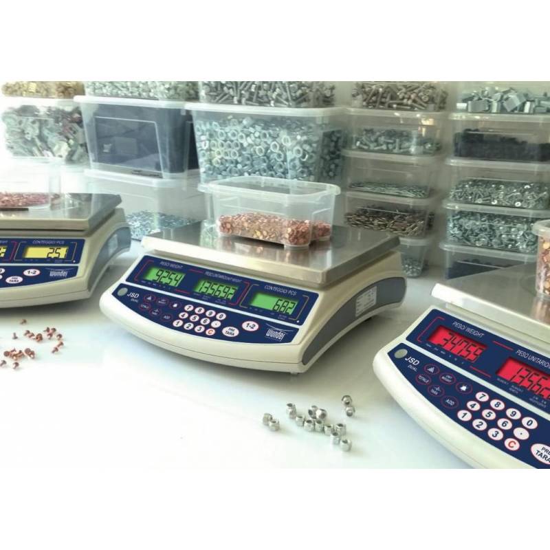 Bilancia contapezzi WUNDER JSD versione ad alta risoluzione (fino a 150.000 divisioni) per conteggio da 0.05 gr fino a 30 kg. Super prezzo, con 200 memorie articoli e controllo visivo dei pezzi con il supporto del check multicolore direttamente sul display. Robustissima ed accurata ( a cella di carico) può essere associata a piattaforme e stampante. Batteria ricaricabile inclusa.
