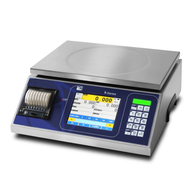 Bilancia contapezzi KSTP con stampante termica integrata e display interattivo a colori.Fornita con software per applicazioni di conteggio quantità e gestione dati, con archivo articoli, archivio clienti e archivio tare e stampe completamente personalizzabili. Elevata risoluzione interna di conteggio grazie alla cella di carico in classe di precisione C6, la più alta classe di accuratezza.