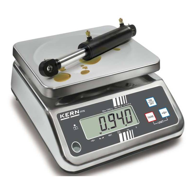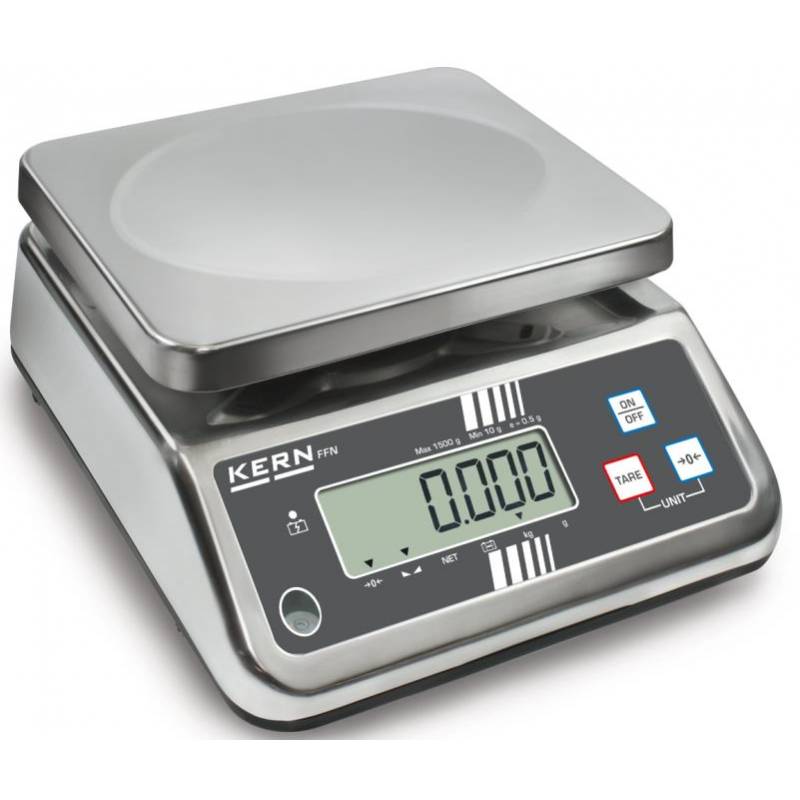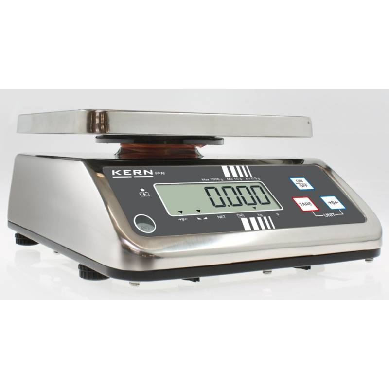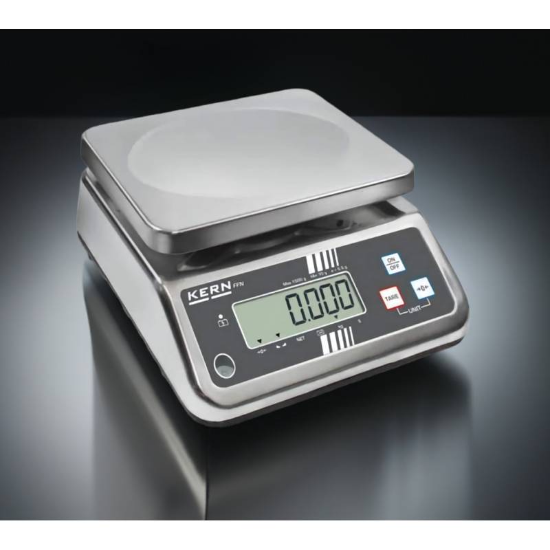 Bilancia da tavolo Kern FFN. Bilancia da tavolo estremamente versatile, con protezione in acciaio inox e classe di protezione IP65. Interamente protetta è best seller nel settore alimentare, ortofrutticolo e per gli ambienti dove è costante la presenza di acqua e grassi.
