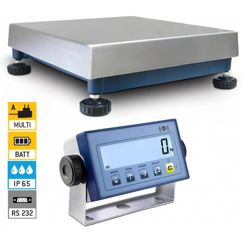 Principali caratteristiche della piattaforma: Funzionamento con cella di carico tipo off center a carico diretto, grado di protezione IP65. Errore di non linearità: 0,02% della portata nominale della cella. Struttura in tubolari di acciaio verniciati a forno di colore blu, piedini di appoggio regolabili e bolla di livello. Piano di carico in acciaio INOX. Cavo schermato di 3 metri per collegamento all’indicatore.