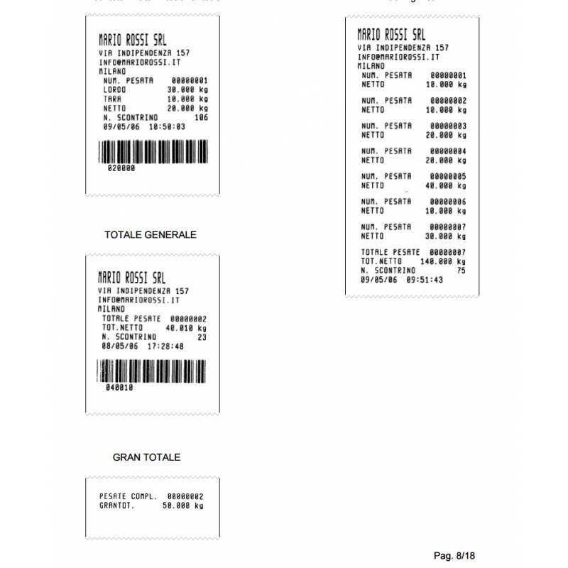 La versione con stampa peso è fornita completa di stampante che può emettere scontrini sia su carta termica normale che adesiva ( l'esempio dello scontrino si trova nella galleria immagini).