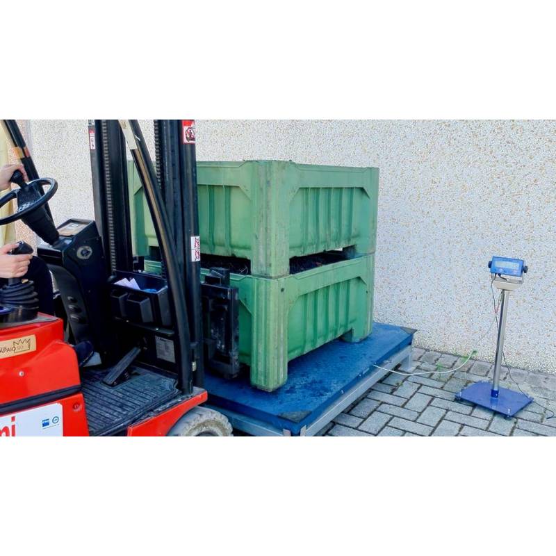 Bilancia da pavimento per pesatura di pallet e bins nell'agroalimentare: frutta, olive, uva. Sia per la vendita all'ingrosso che per aziende agricole, frantoio, centri di confezionamento, raccolta e smistamento. Omologazione legale CE -M, opzione stampante per scontrino pesate, portata 3000 kg e piatto 1250x1500 oppure 1500x1500 mm. Ideale anche per cassoni di stoccaggio frutta secca, nocciole.