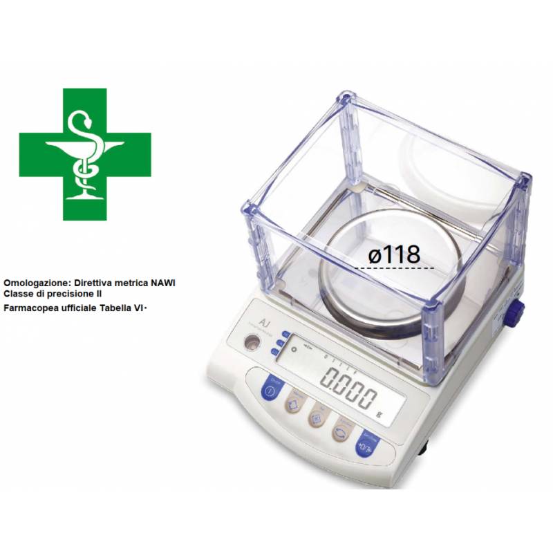 Bilancia per farmacie serie AJH con Omologazione metrologica : Direttiva metrica NAWI in Classe di precisione II e conforme alla farmacopea ufficiale Tabella VI, Dotata di Dichiarazione di Conformità del produttore Shinko Denshi (Japan).