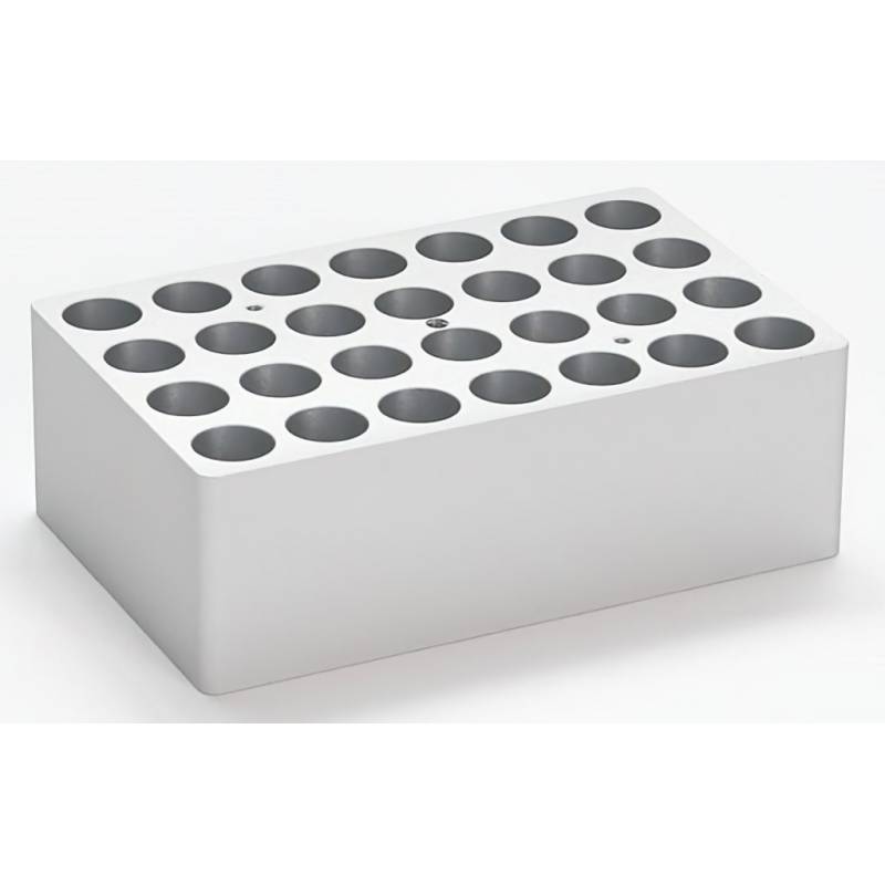 Blocco 28 fori per provette 5/15 ml. Ogni blocco presenta un filetto centrale per l’estrazione (tramite asta dedicata) e almeno 2 fori per il controllo della temperatura (Ø del foro 3 mm).