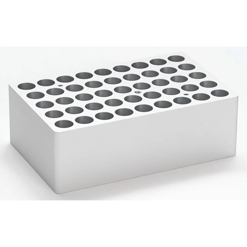 Blocco 45 fori per provette 5 ml . Ogni blocco presenta un filetto centrale per l’estrazione (tramite asta dedicata) e almeno 2 fori per il controllo della temperatura (Ø del foro 3 mm). Ogni blocco è fornito senza asta di estrazione.