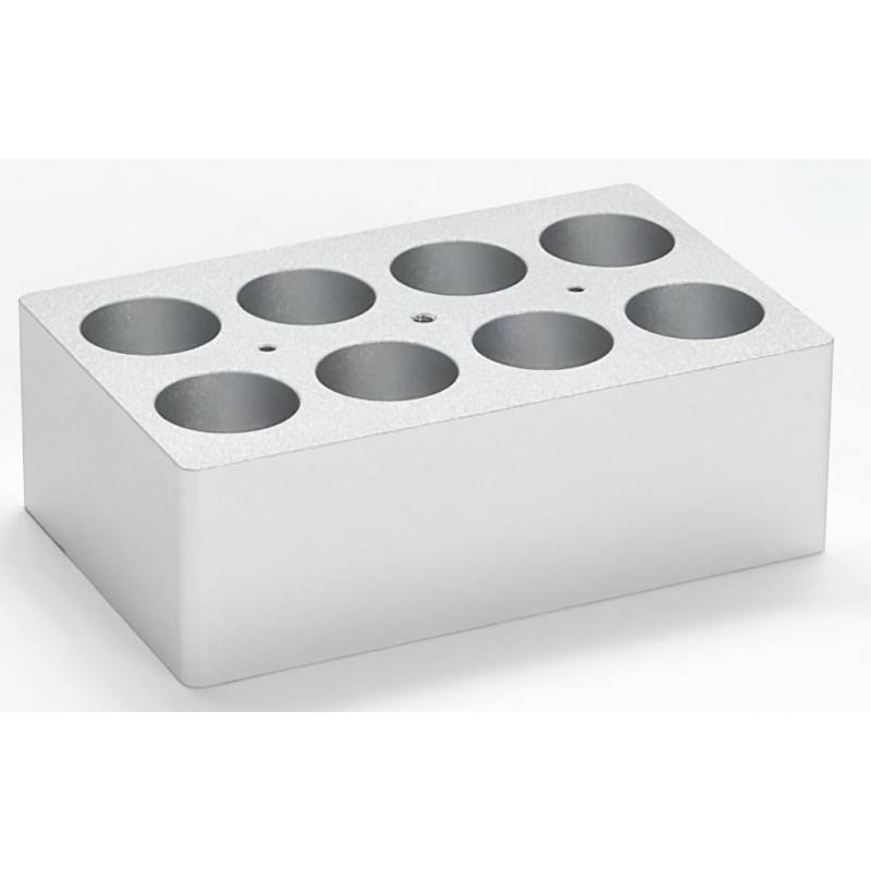 Blocco 8 fori per provette 50 ml. Ogni blocco presenta un filetto centrale per l’estrazione (tramite asta dedicata) e almeno 2 fori per il controllo della temperatura (Ø del foro 3 mm). Ogni blocco è fornito senza asta di estrazione.