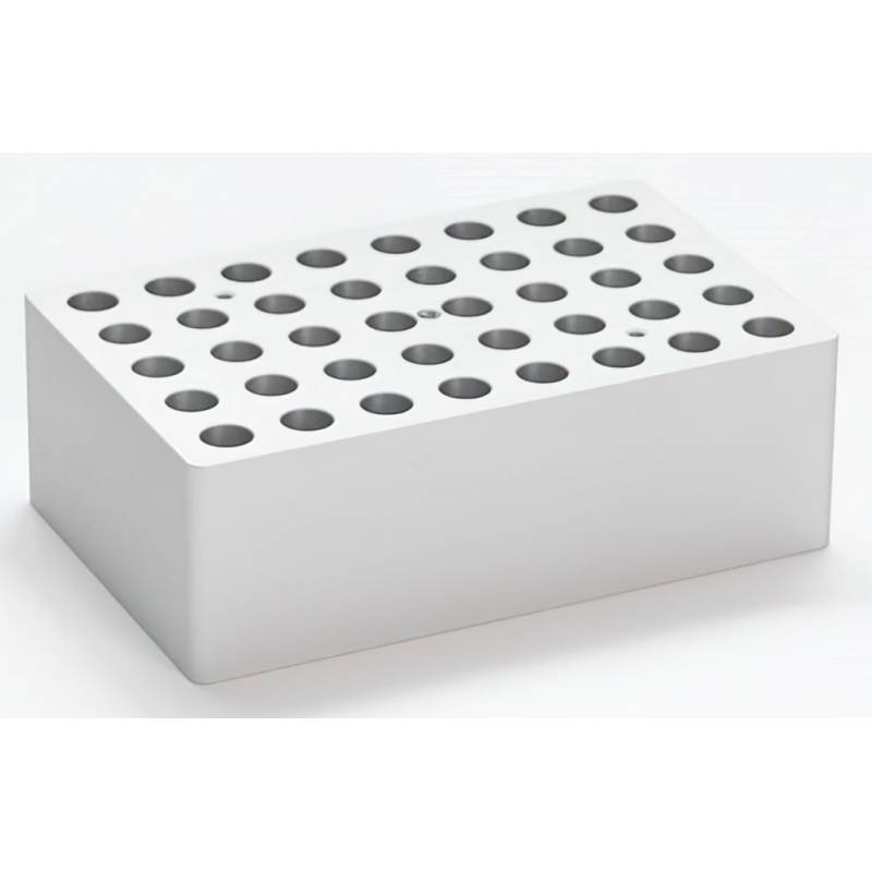 Blocco con 40 fori per provette da 1,5 ml. Ogni blocco presenta un filetto centrale per l’estrazione (tramite asta dedicata) e almeno 2 fori per il controllo della temperatura (Ø del foro 3 mm). Ogni blocco è fornito senza asta di estrazione.