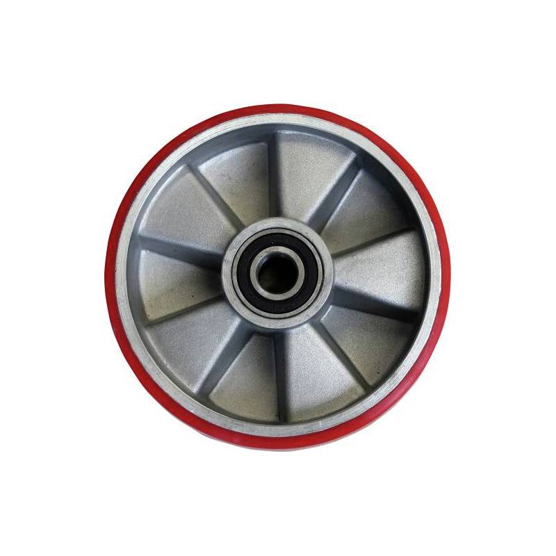 Coppia di ruote per timone di guida del transpallet VHB in poliuretano rosso. Sostituiscono le normali ruote e sono adatte a pavimenti chiari. Eventuali segni di abrasione saranno minimi e molto meno visibili rispetto alle ruote standard.