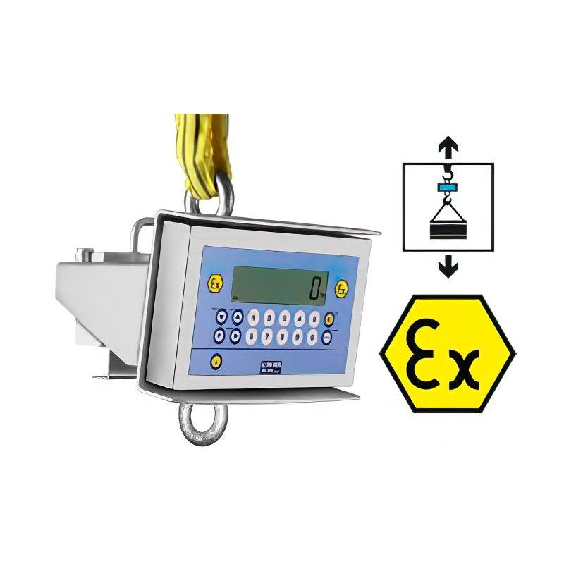Dinamometro MCWX2GD per pesatura in zone ATEX classificate a rischio di esplosione (ZONA 1 e 21, 2 e 22) con modo di protezione secondo Ex II 2GD IIC T4 T197°C X. Struttura completamente in acciaio INOX, con grado di protezione IP65. INGOMBRO VERTICALE RIDOTTO per lo sfruttamento ottimale dei mezzi di sollevamento. Predisposto per montaggio di campanella di raccordo superiore e gancio inferiore. Singola sicurezza, per sollevamento del carico e pesatura.