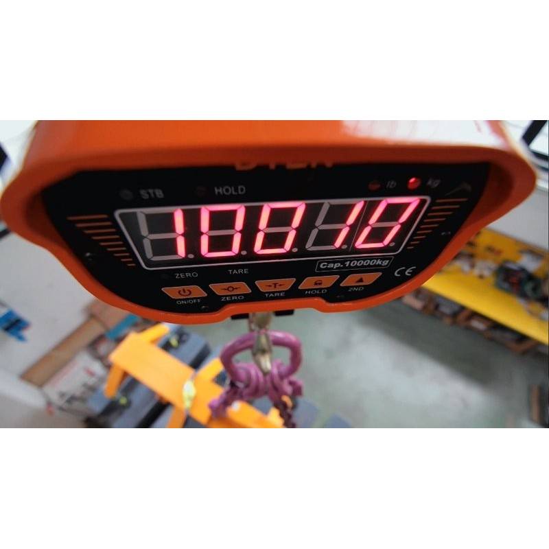 Dinamometro DTEN con portata di 20 ton, completo di gancio e telecomando. Idoneo per carroponte e gru. La soluzione con il miglior rapporto prezzo / prestazioni per i grandi carichi fino a 20000 kg di sollevamento. Precisione di +- 0.03% f.s. Robusto, affidabile, il più venduto per le pesate di controllo in azienda.