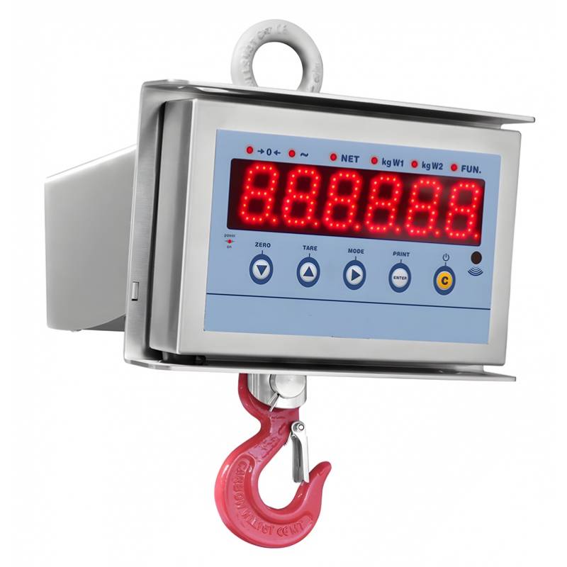 Grillo superiore e gancio inferiore di serie. Ridotta distanza tra grillo superiore e gancio inferiore. Precisione: +/- 0.05% su F.S. Contenitore in acciaio INOX IP67. Telecomando a infrarossi di serie, per funzionamento fino a 8 m di distanza. Il telecomando può essere configurato per eseguire solo la funzione del tasto tara o le funzioni dell'intera tastiera. Batteria ermetica ricaricabile, con autonomia di 40 ore circa. Caricabatteria 230Vac 50 Hz in dotazione. Temperature di funzionamento: -10 /+40 ºC. Filtro digitale e autospegnimento programmabili. Telecomando a infrarossi a 19 tasti (di serie), funzionamento fino a 8m: zero; tara / tara manuale; attiva / disattiva funzione;spegnimento.