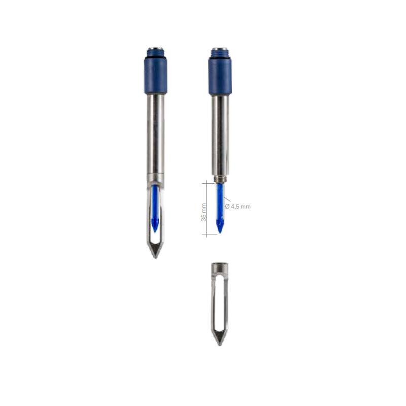 Elettrodo a penetrazione 2 PORE K in acciaio e completo di lama rimovibile / intercambiabile. E' utilizzabile per carni, insaccati, salumi. La lama in acciaio inox aiuta l'utente ad effettuare misure non intrusive di prodotti a base di carne, all'interno e all'esterno. La giunzione aperta previene le occlusioni e il materiale del corpo esterno non è tossico e ideale per alimenti.
