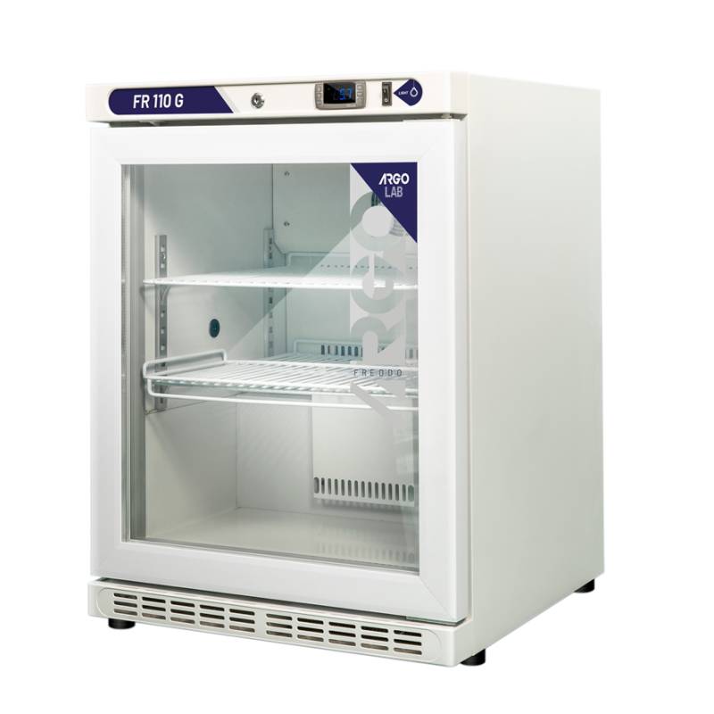 Frigorifero ARGOLAB, da laboratorio FR 110 G, con porta a vetro, volume 110 litri. Range +2/+8°C con risoluzione allo 0.1 °C. Display digitale a controllo elettronico, allarme minimo/massimo, refrigerazione dinamica/forzata. Serratura con chiave. Posizionabile da incasso, sottobanco. Apertura porta reversibile, completo di 3 ripiani in acciaio plastificato forniti di serie.