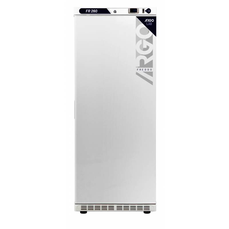 Frigorifero verticale professionale per impieghi di laboratorio ARGOLAB FR 260 litri, porta cieca, provvisto di ruote per un agevole spostamento. Con display digitale a controllo elettronico, allarmi di temperatura, porta aperta e sbrinamento manuale e automatico. Conforme con la direttiva EN 60068-3 e conformità con la direttiva tecnica DIN 12880.