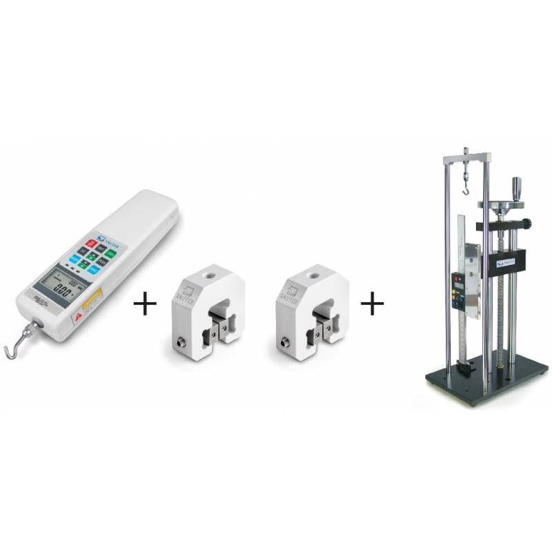 Componenti del Kit: Dinamometro Digitale SAUTER FH500 + Due Morsetti a Pinza AE 500 per il fissaggio sicuro di una vasta gamma di campioni + Banco di Prova Manuale TVL con calibro digitale integrato.