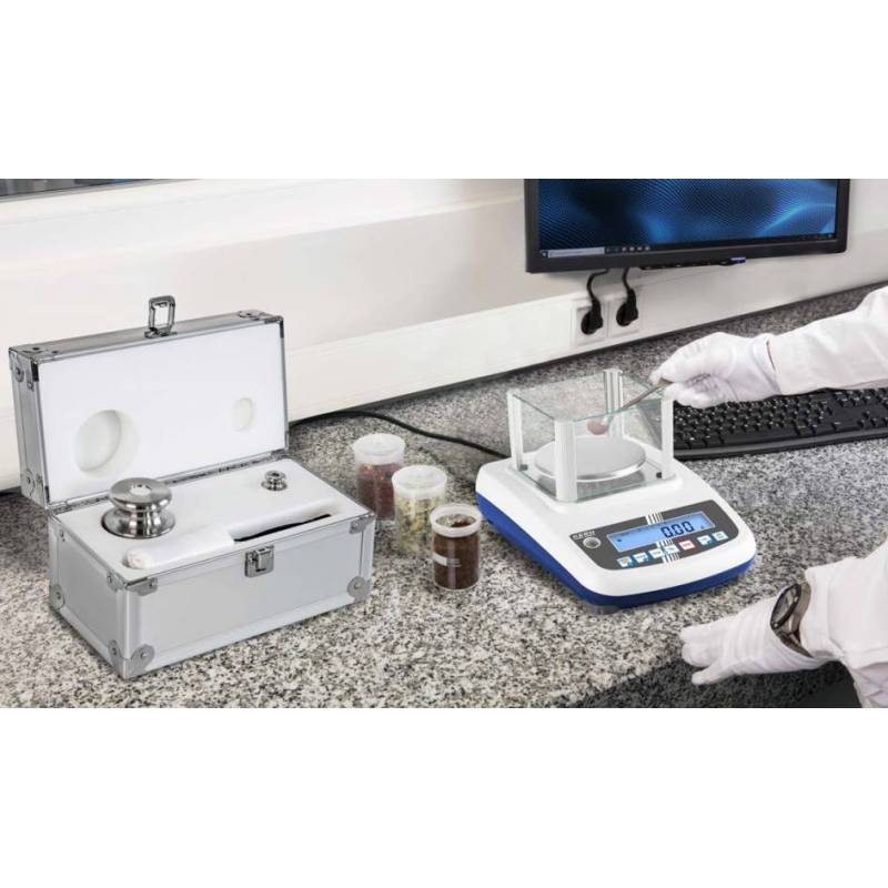 peso di prova per controllare la sensibilità, cioè la corretta regolazione della vostra bilancia, e un piccolo peso di calibrazione per controllare all'estremità inferiore dell'intervallo di pesata, il cosiddetto peso minimo del campione.