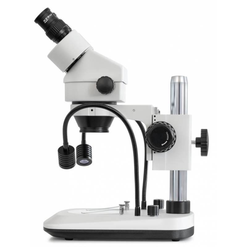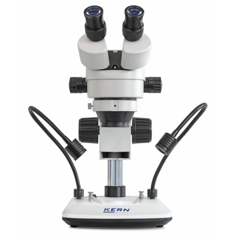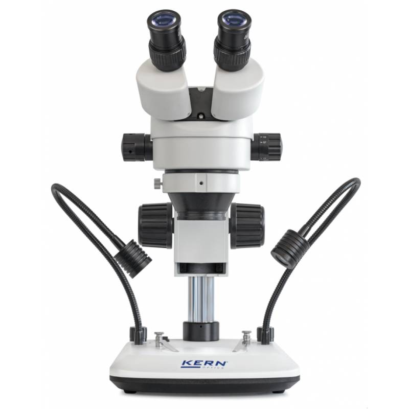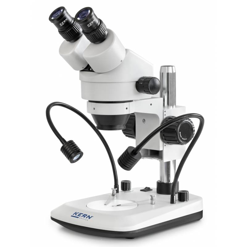Microscopio Stereo Kern serie OZL-47 con obiettivo zoom per ingrandimento continuo di 7×–45×. Potente sistema di illuminazione LED da 3W a luce riflessa. Due versioni: binoculare o trinoculare. Stativo a colonna incluso, pronto all'uso. Ampia scelta di obiettivi, oculari e adattatori per telecamera/fotocamera. Flessibile, potente, adatto per formazione, centri di prova e laboratori.