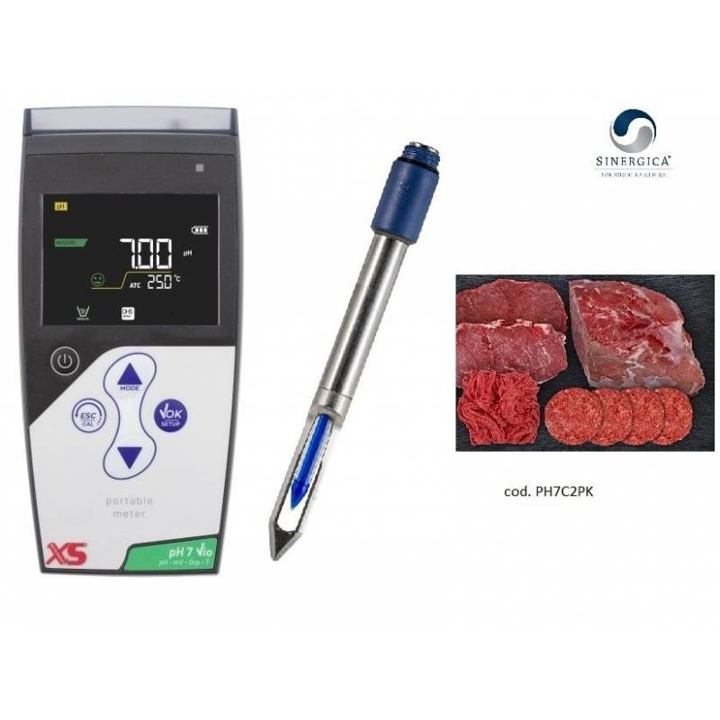 pHmetro portatile, professionale, per l'industria della carne e salumi. I 3 kit prevedono lo strumento tutto Made in Italy, PHVio, abbinato ai sensori di ph specifici del settore: classico con la punta e corpo in plastica, con il corpo in acciaio e il tipo in acciaio con lama da taglio per i semi-congelati. Elettrodi intercambiabili per gestire le diverse lavorazioni e tagli.