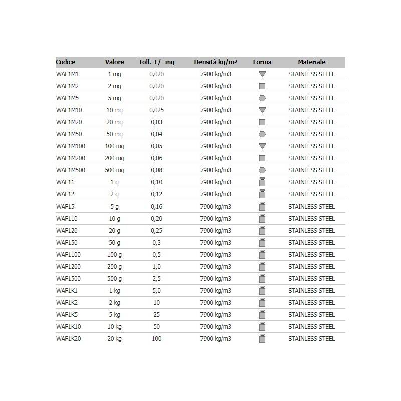 Pesi Campione in classe F1, adatti nelle applicazioni di metrologia legale, nel settore industriale e nella ricerca. La classe di precisione F1 consente l'uso di questi pesi per il controllo e la taratura di bilance e strumenti in classe II fino a 100.000 divisioni. Conformi alla raccomandazione OIML - R111. Classe di precisione F1.