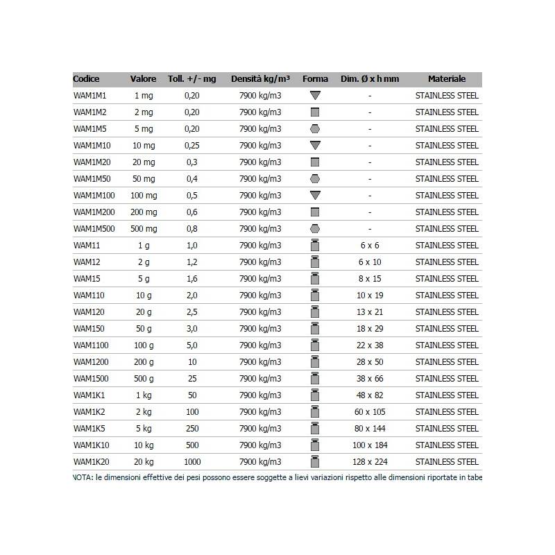 Caratteristiche principali : CONFORMI ALLA RACCOMANDAZIONE OIML R111 ; CLASSE DI PRECISIONE M1; ESECUZIONE IN ACCIAIO INOX LUCIDATO AUSTENITICO