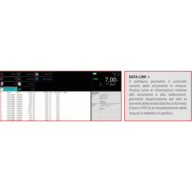 È sempre possibile consultare i dati di calibrazione e la rappresentazione, attraverso le icone, dei buffers utilizzati, rende più efficiente il processo di taratura. Funzione Data Logger automatica o manuale con valori memorizzabili in formato GLP sulla memoria interna (1000 dati), sul PC oppure stampabili in formato cartaceo.