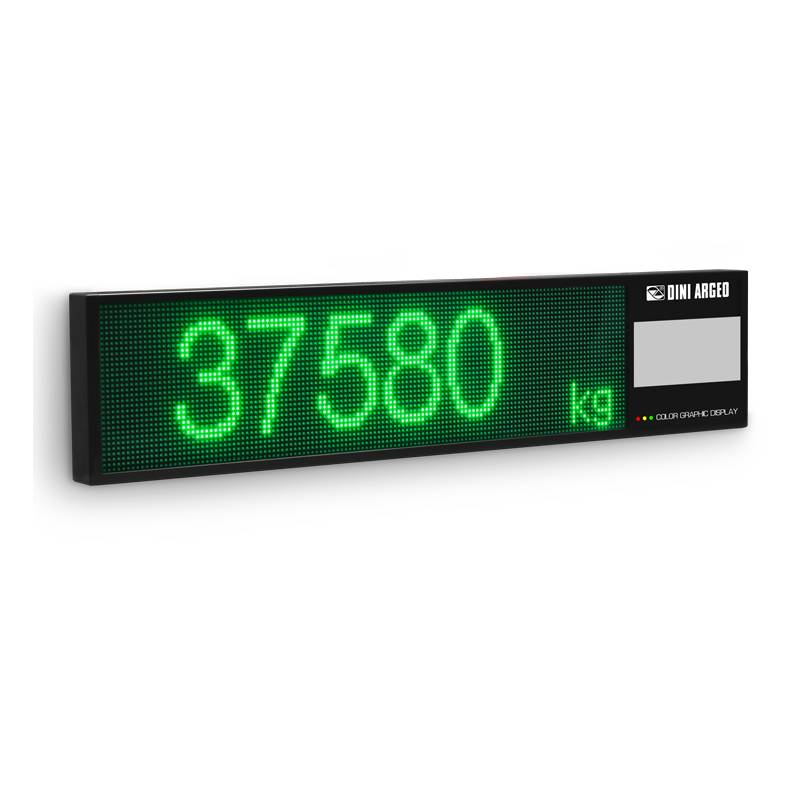 Contenitore in acciaio verniciato, con protezione IP54. Idoneo per utilizzo indoor oppure outdoor (opportunamente protetto dalla pioggia). Display a matrice di LED SUPERLUMINOSI RGB, dimensioni 605x150mm. Modalità numerica: fino a 6 cifre, h= 110mm con icone metrologiche (stabilità, azzeramento, NET etc.). Modalità alfanumerica: fino a 2 righe da 16 caratteri, h= 42mm.