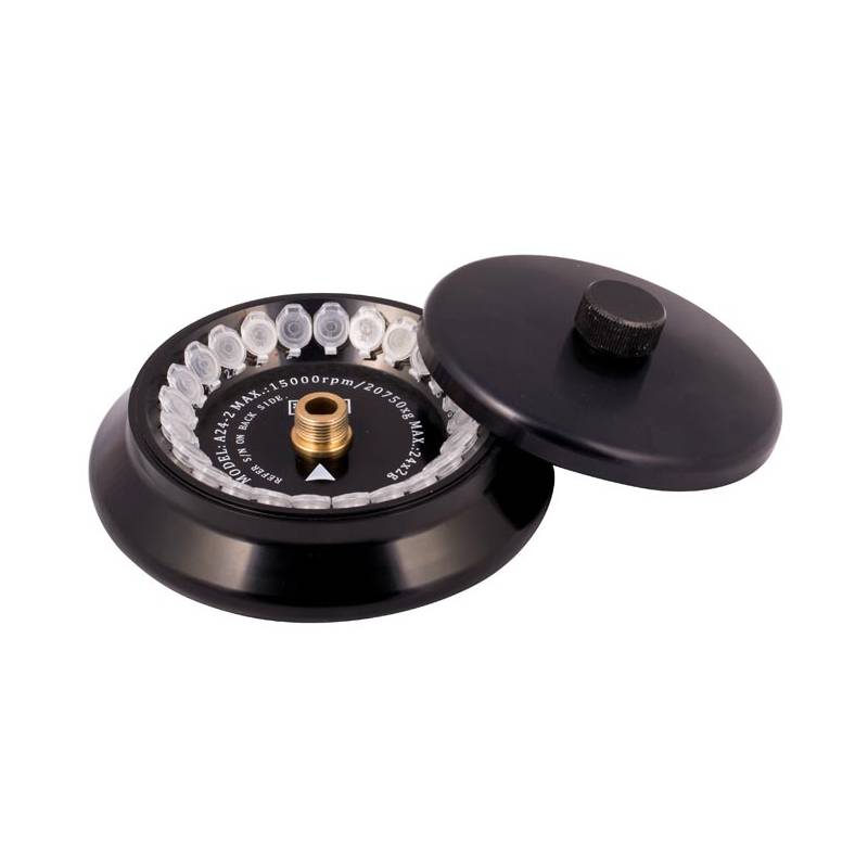 codice 40100842 / A 24-2 : Rotore ad angolo fisso 45° per provette tipo Eppendorf® da 1,5-2 ml, numero max per rotore 24. Velocità massima 15.000 rpm, accelerazione massima 21.000 xg. Fornito di coperchio di Biosafe. Max 24 provette.