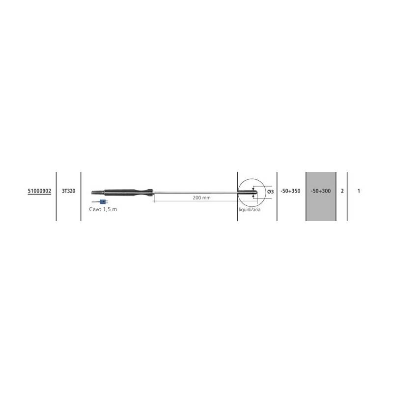 Il sensore termocoppia T modello 3T320 è progettato per l'utilizzo con termometri digitali Temp 7 K/T. Costruito in acciaio inox con punta semisferica (Ø 3 mm, lunghezza 200 mm) offre accuratezza ±0,5 °C e tempi di risposta rapidi (T90: 3 s). Adatto per settore alimentare, HACCP e farmaceutico.
