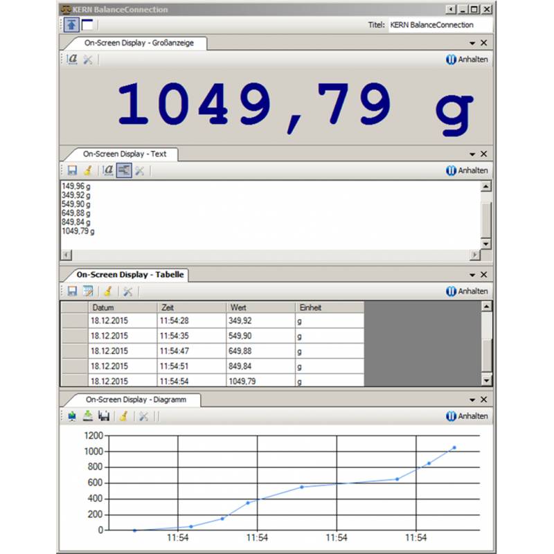 In dotazione: 1 CD, 1 licenza, lingue: inglese. Il cavo d‘interfaccia è compreso se ordinato contemporaneamente ad una bilancia KERN.