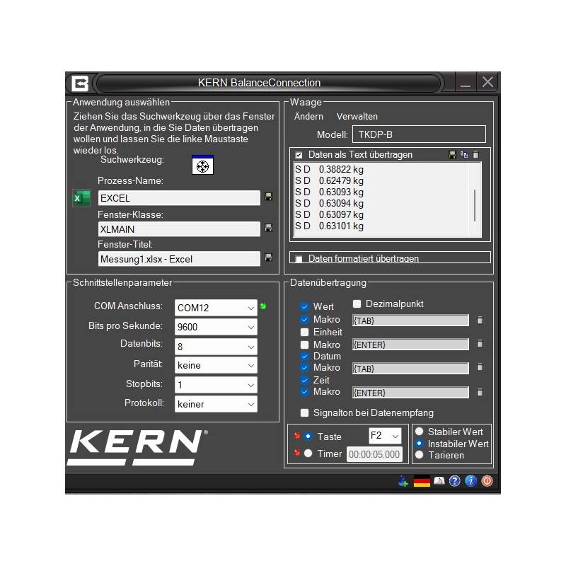 Software Balance Connection SCD-4.0 per la trasmissione diretta dei dati di pesata delle bilance nelle applicazioni Windows. Utilizzabile con bilance Kern & Sohn selezionate. Versioni basic e professional multi postazione. Per Microsoft Excel, Access, Word o file di testo CSV. Per sistemi operativi Windows 10, 11. È richiesto .NET Framework 4.8.1