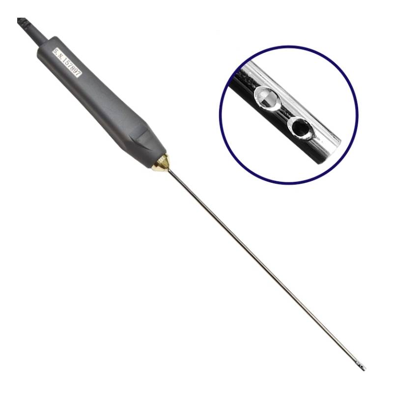 Sonda PT100 - PT56A. Con manico in materiale antiscivolo, resistente, piacevole al tocco e facile da pulire. Stelo resistente in acciaio inossidabile. Puntale aperto al passaggio del flusso d'aria. Esclusivamente per misure in aria. Compatibile con termometri pt100 Vio Temp7 e Temp70.