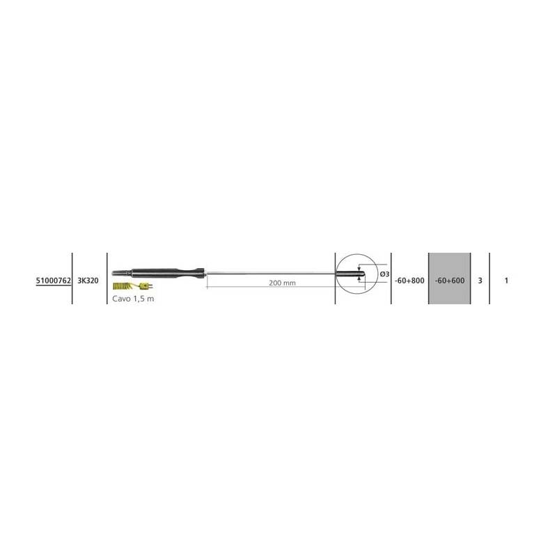 Termocoppia K tipo 3K 320 fino a +800 °C per misure in liquidi e aria. Tempi di risposta eccezionalmente veloci con il 90% della misura in soli 3 secondi. Certificabile Accredia. Compatibile con termometri digitali TEMP 7 K/T e modello TM 947 SD.