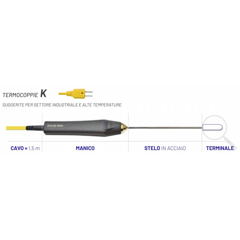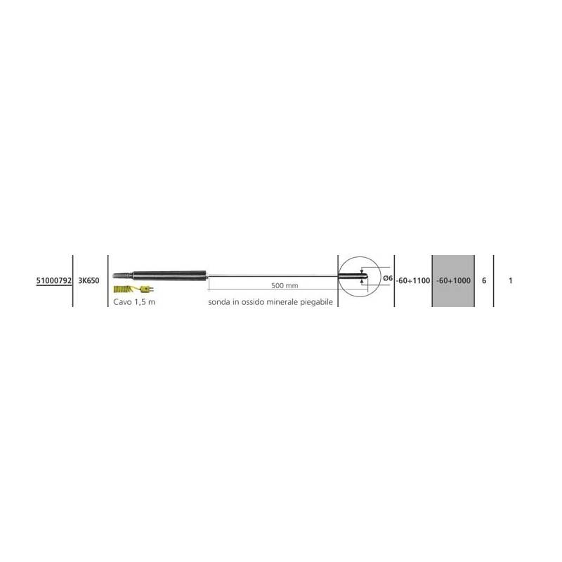 Sensore termocoppia K 3K650, Stelo resistente piegabile, modellabile a mano. In acciaio inossidabile, lunghezza 500 mm. Campo di misura -60..+1100°C. Puntale semisferico per misure in liquidi e aria.