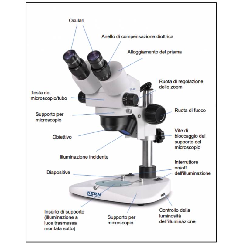 Stereomicroscopio da laboratorio e per controllo qualità KERN OZL-451, linea LAB LINE, binoculare con eccezionale campo visivo e obiettivo zoom 7,5×–50×. Illuminazione standard alogena per un immagine particolarmente chiara ad alto contrasto a luce incidente e a luce passante garantisce l’illuminazione ottimale del campione trasparente o non trasparente. Pronta spedizione ad un ottimo prezzo.