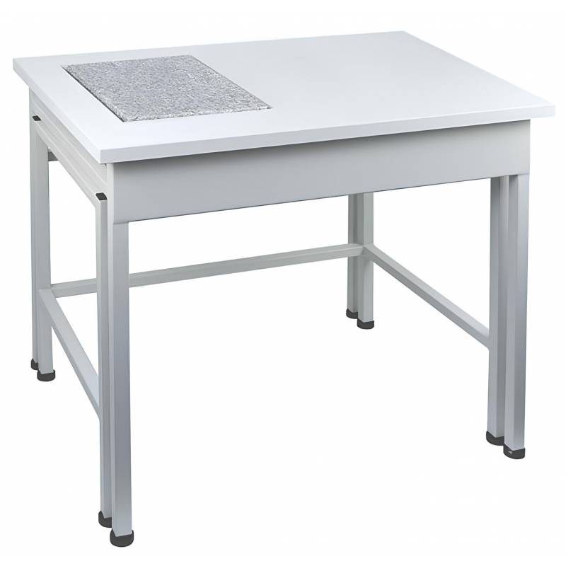 Tavolo di pesatura antivibrante compatto e stabile, con struttura in acciaio verniciato e piano in granito ad alta densità. Ideale per bilance di precisione e strumenti da laboratorio.