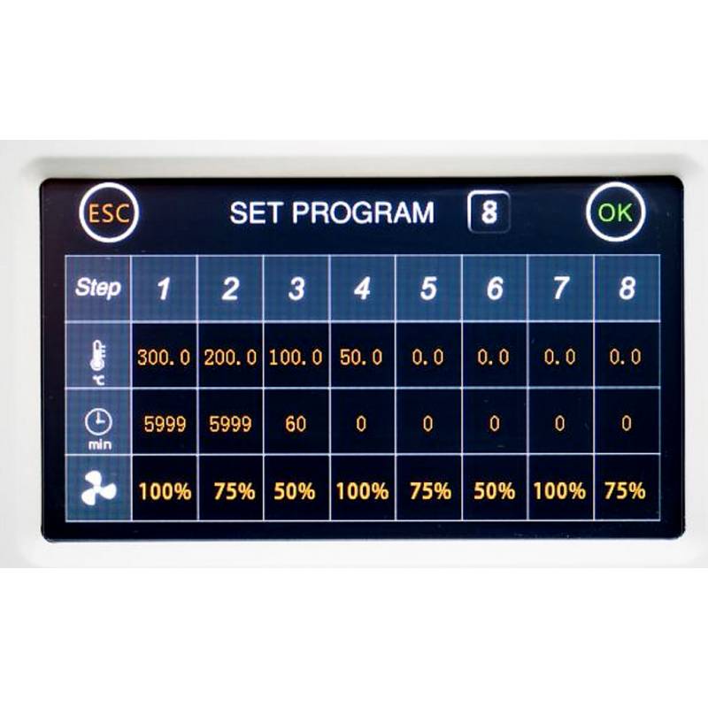 Versione Plus, 7 programmi memorizzabili con 10 step ciascuno (temperatura, tempo, velocità ventilazione) ed un ulteriore programma di base a singolo step di funzionamento (temperatura, tempo, velocità ventilazione).