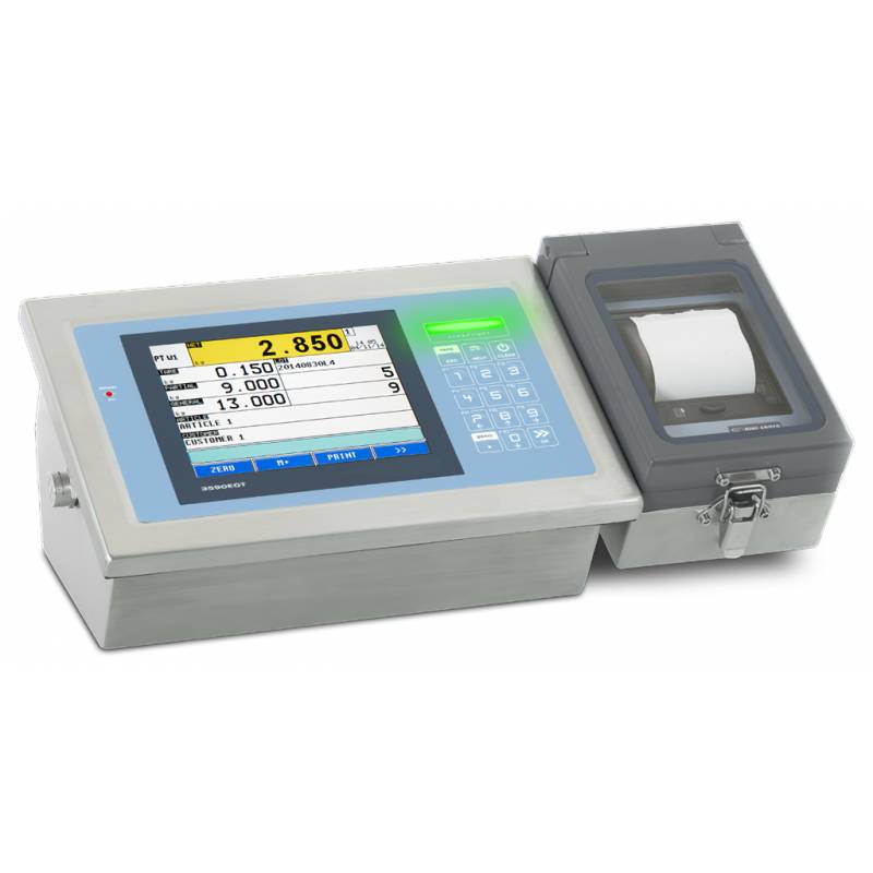 Versione con stampante termica solidale (3590EGTP) : Stampante termica solidale a indicatore 3590EGT. Contenitore in acciaio INOX IP65 e sportello di protezione contro spruzzi e polvere, per ambienti gravosi o ad elevato grado di igiene. Alimentazione da indicatore.