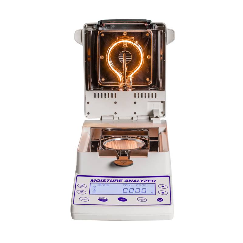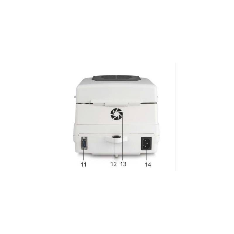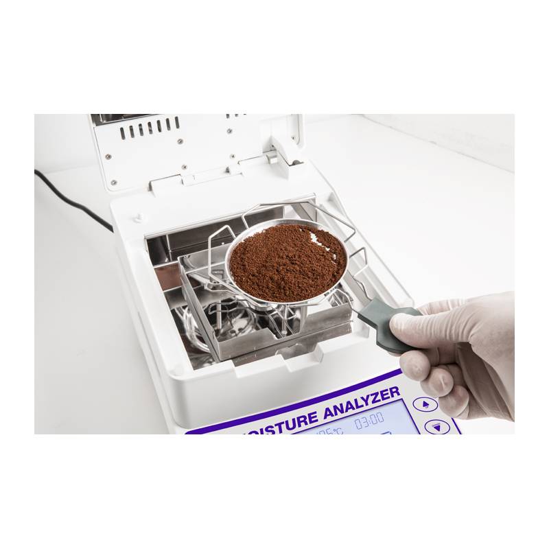 Display retroilluminato. Piatto di pesata tondo con diametro 90 mm in acciaio inox. Protocollo di utilizzo GLP. Memoria interna per lo svolgimento automatico di 15 cicli di essiccazione. Tre metodi di essiccazione: Soft, Standard e Fast. Lampada alogena da 400W. Fornita con massa campione per la taratura e il controllo e 50 piattelli in alluminio. Uscita RS 232 di serie per collegamento a PC o con la stampante. Certificato di taratura riferibile Accredia incluso nella fornitura.