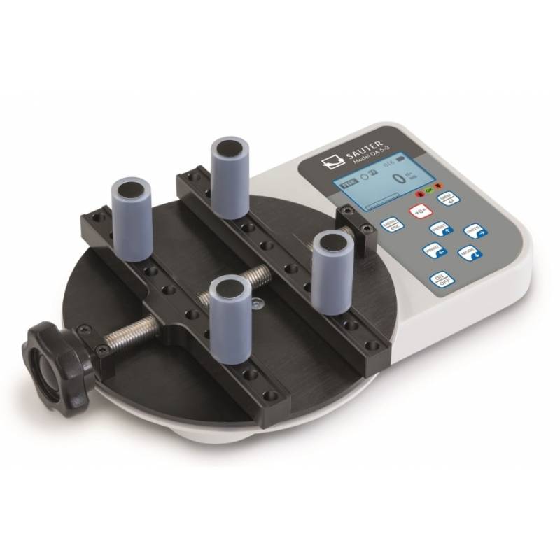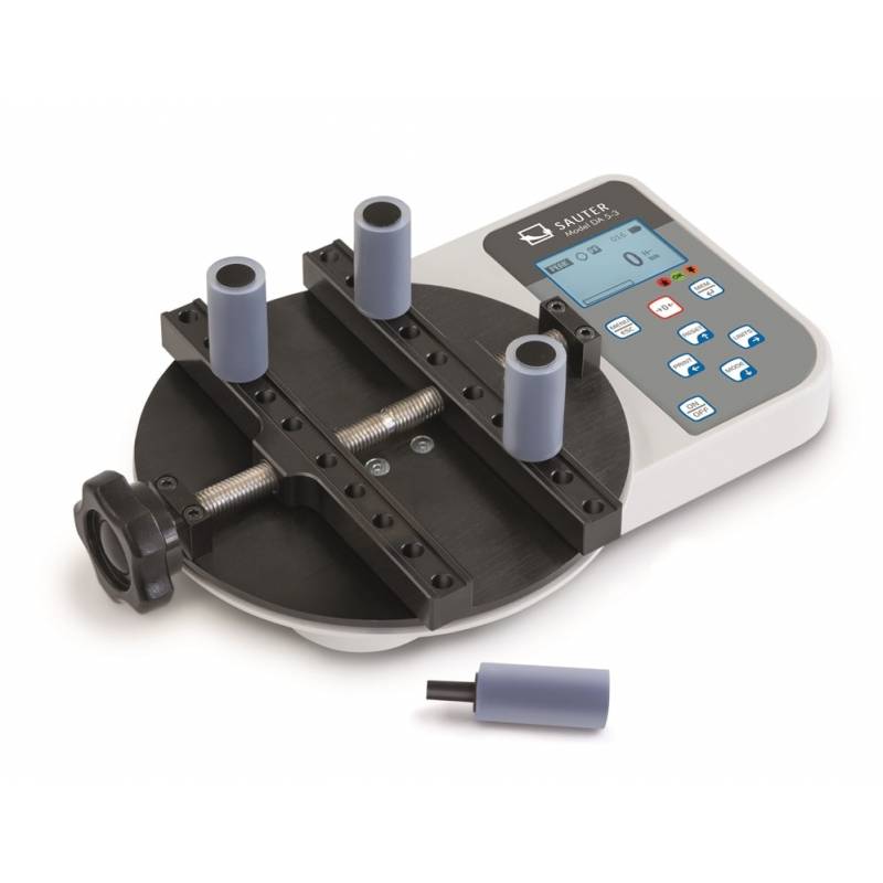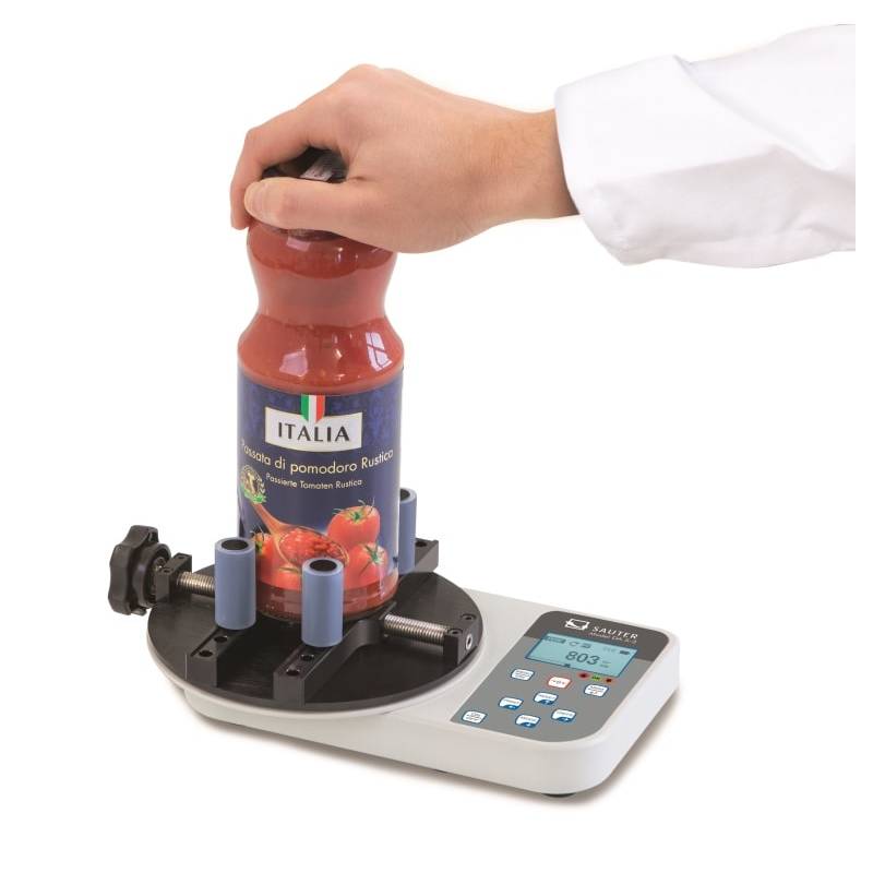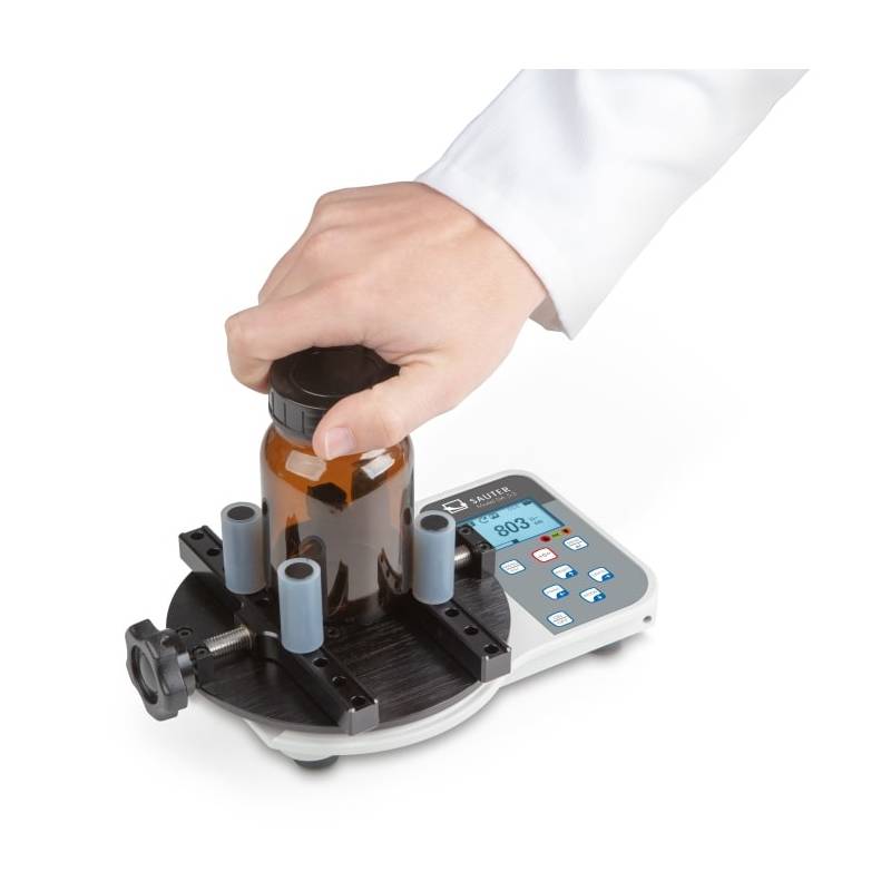 Torsiometro digitale SAUTER DA per il controllo statico e la determinazione della forza di torsione applicata nell'apertura e chiusura di tappi di bottiglie, tappi a vite, vasetti. Sistema quick-pin con 4 supporti per bottiglia per una rapida configurazione in base al diametro. Per industria alimentare, bevande e farmaceutica. Servizio di calibrazione ISO in opzione.