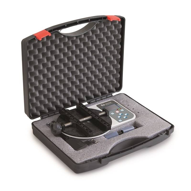Incluso nella fornitura : quattro Quick-pins (supporti per bottiglie) con rivestimento in gomma, resistente valigetta per il trasporto. La memoria dati interna archivia fino a500 dati di misura. Il contenuto della memoria può essere trasferito al PC tramite un software opzionale. Interfaccia dati USB e RS-232 per PC compresa. Funzione Peak-Hold per visualizzazione del picco di carico. Utilizzabile in entrambi i sensi di rotazione. Funzione valore limite, programmazione di Max/Min, in direzione di trazione e di spinta, con emissione di un segnale acustico e visivo. Modalità di funzionamento ideale per il controllo efficiente e senza errori di pezzi costruiti in serie. Funzione AUTO-OFF per risparmiare l'accumulatore.