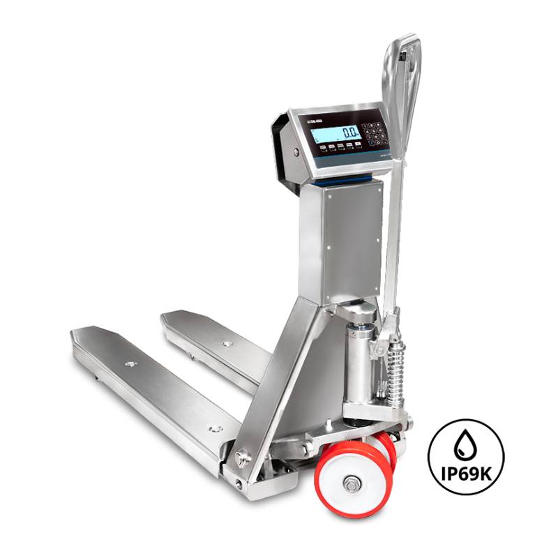 Transpallet con bilancia progettato per i rigorosi standard dell'industria alimentare, chimica, farmaceutica e cosmetica. Progettato e prodotto in Italia, la linea HYGIENX vanta capacità di lavaggio completo, grado di protezione IP69K e costruzione completa in acciaio inossidabile. Può resistere a lavaggi ad alta temperatura e ad alta pressione per la massima igiene.