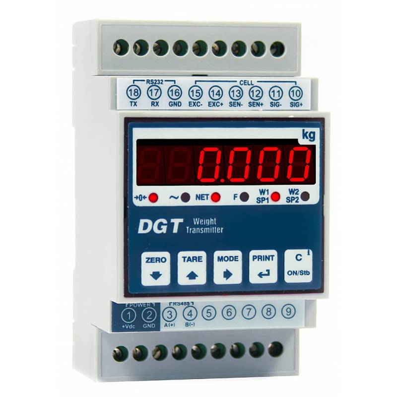 Trasmettitore/indicatore di peso digitale DGT1. Un dispositivo multifunzionale progettato per il monitoraggio del peso in applicazioni industriali. Grazie alle sue dimensioni compatte, è facilmente installabile su barra DIN o in pannelli da parete, con opzioni di alimentazione esterne. Dotato di porte RS232 e RS485 configurabili per la connessione con sistemi esterni. Uscite analogiche e digitali.