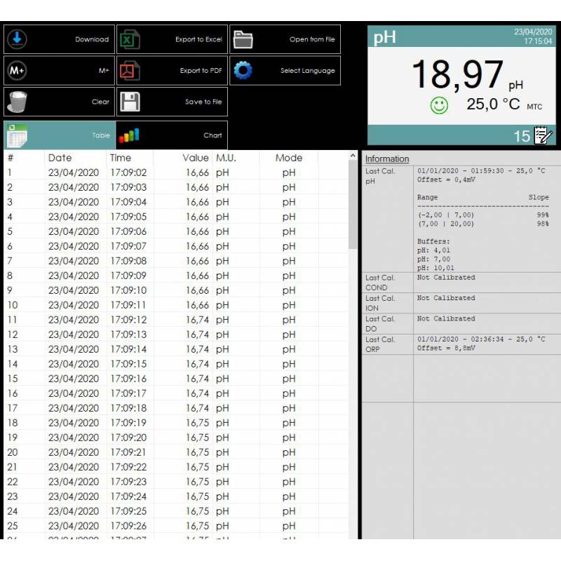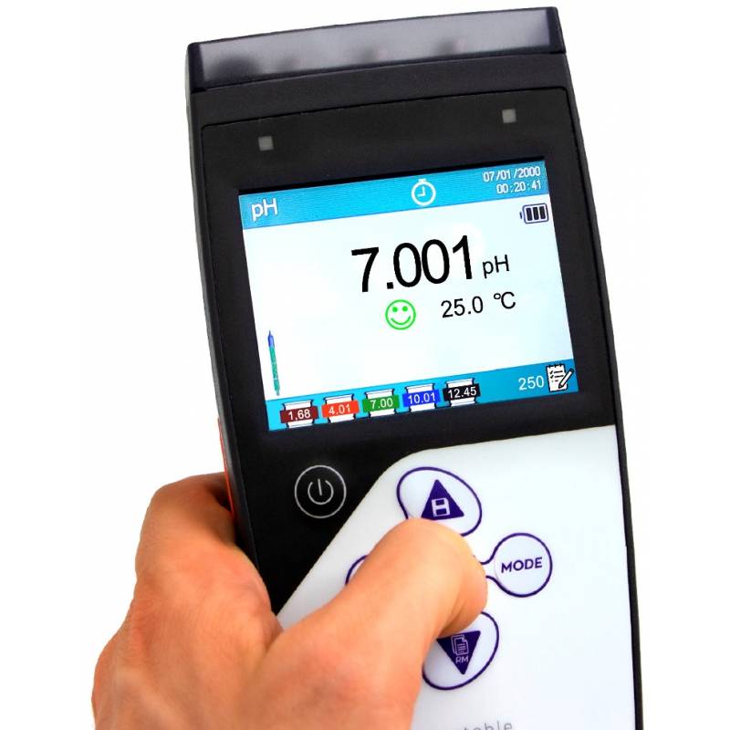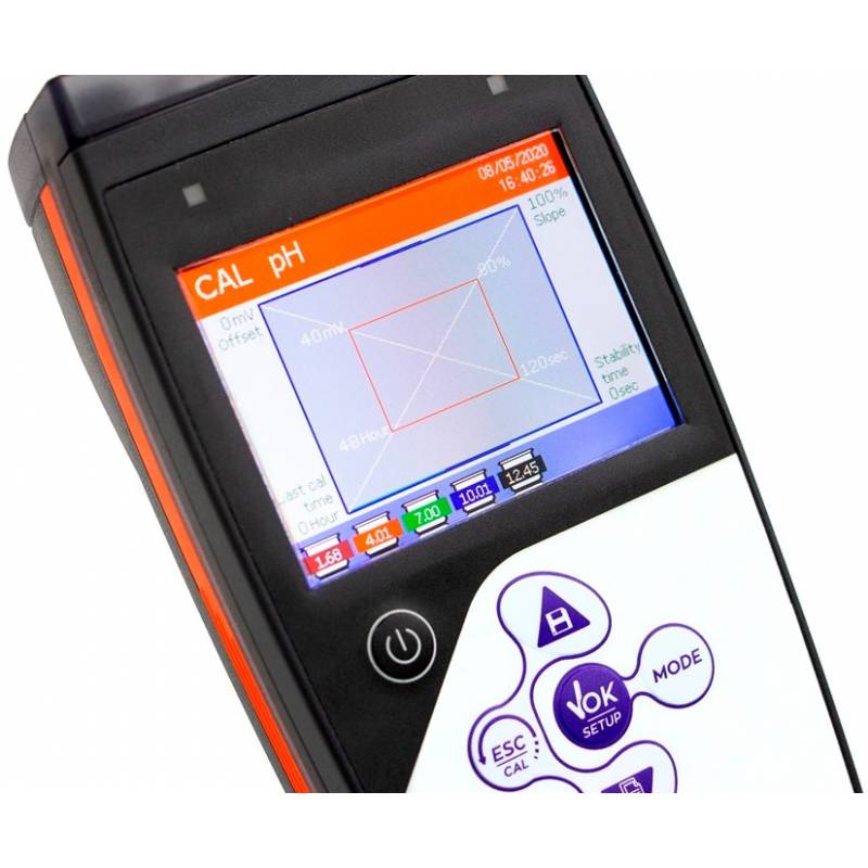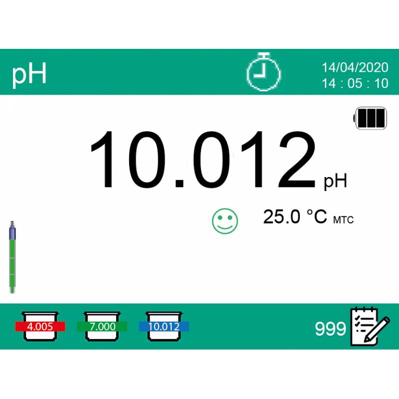 CALIBRAZIONE INTELLIGENTE: Calibrazione automatica guidata con riconoscimento degli standard, o su valori scelti dall’utente. Al termine di ogni calibrazione viene mostrato il grafico (pH) e i dati di calibrazione. I punti calibrati sono sempre visualizzati a display.